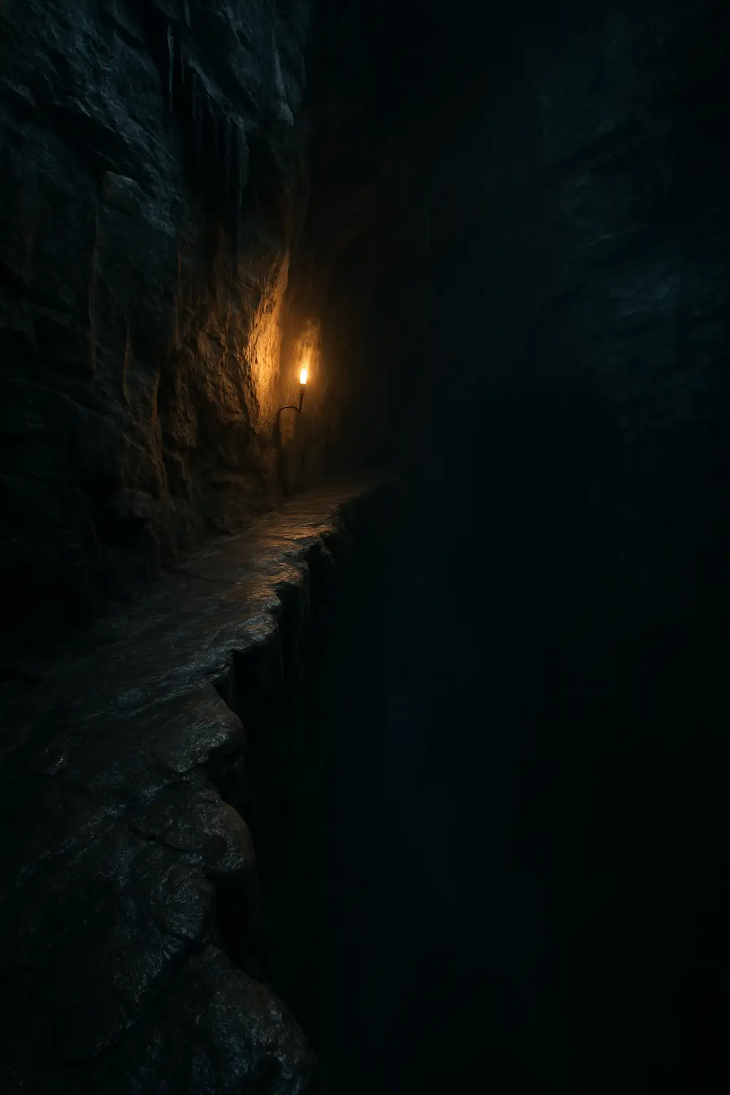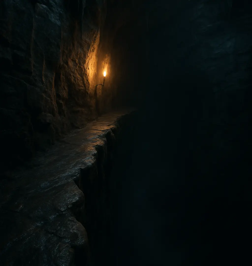 Ahead, the passage opened into something that defied comprehension. A ledge carved from living rock stretched along the rim of an abyss so vast that dropped parchment flames winked out before touching bottom. The chasm breathed with malevolent life, exhaling whispers that grew sweeter and more familiar with each passing hour.